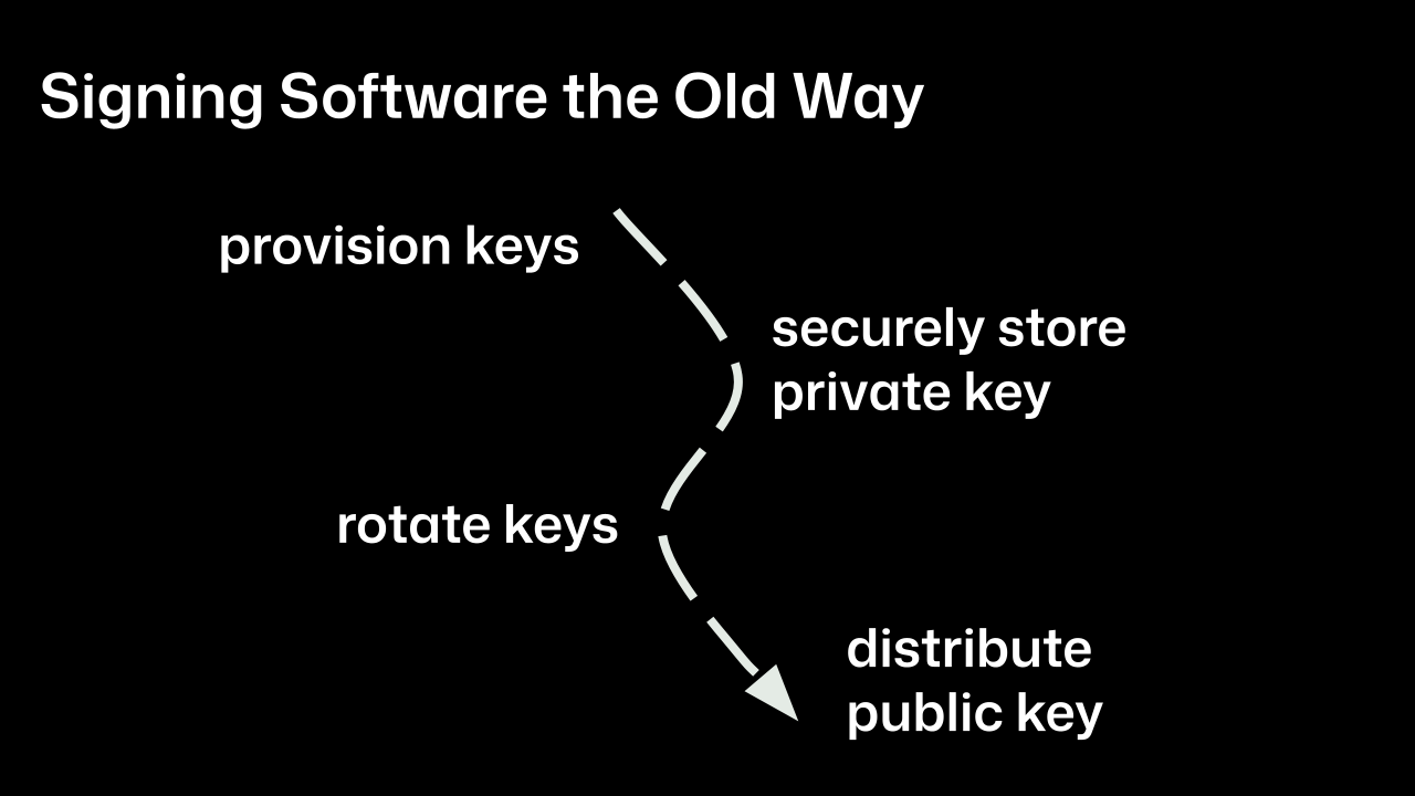 There have been different approaches to signing software over the years, but many of them are quite complicated and require a lot of manual steps. You have to provision a public / private keypair, and then keep the private key as protected as possible (since that's what generates the signatures) while simultaneously distributing the public key as widely as possible so people can verify the signature.