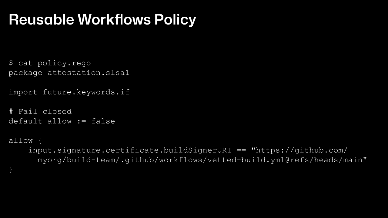 Here's an example of a policy that checks that our build process used the reusable workflow we were expecting. Again, these policies can be as simple or complex as you want, and you can refer to any items in the JSON output of gh attestations verify.
