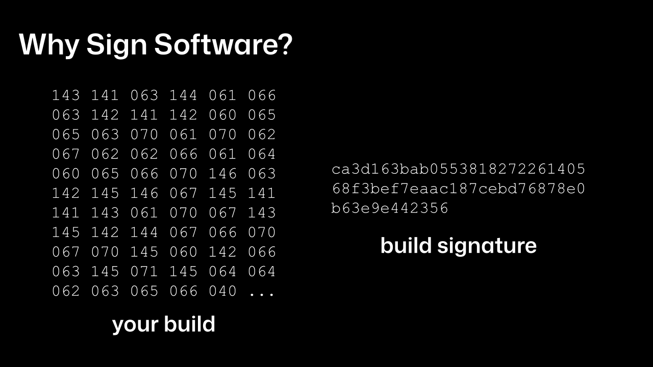 On the right is a signature over that build. We won't get into the details of asymmetric cryptography here, but essentially you make a public / private keypair and produce a signature that's hundreds of bytes or a few kilobytes. If any of the bytes of the build change, the signature will no longer verify. And you can only produce a valid signature if you have access to the private key.