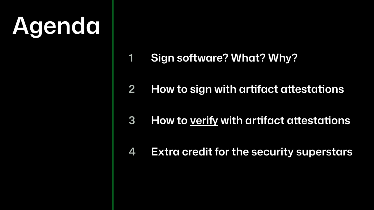 We're going to talk about what we mean by signing builds, why it's a good idea to sign them, and crucially show how to verify those signatures as well.