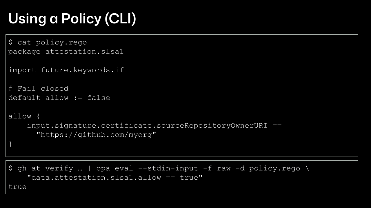 The box on the top shows our rego policy. We're using the attestation.slsa1 package, we want to default to not allow the policy to verify, and here we're doing the same check as before, that our container image was built in our GitHub organization. But you can add as detailed a verification policy as you want.