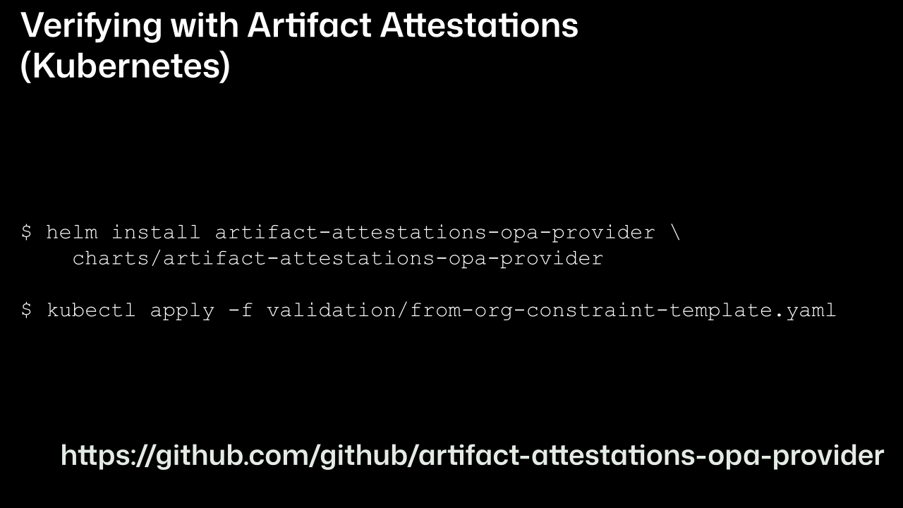 Open Policy Agent has Gatekeeper which is a popular way to enforce admission policy. We built an integration between Artifact Attestations and Gatekeeper. You can easily install it with helm, and in the repository are various policy templates you can modify to meet your needs and then use kubectl apply to run them in your cluster.