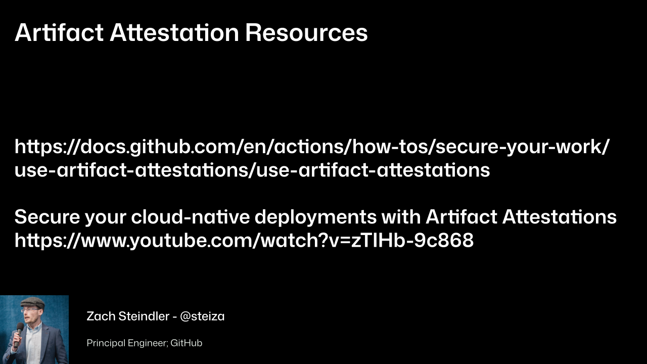 We have great resources that you can share with people in your organization, including our documentation on Artifact Attestations and a 5 minute video focusing on cloud-native deployments with Artifact Attestations.