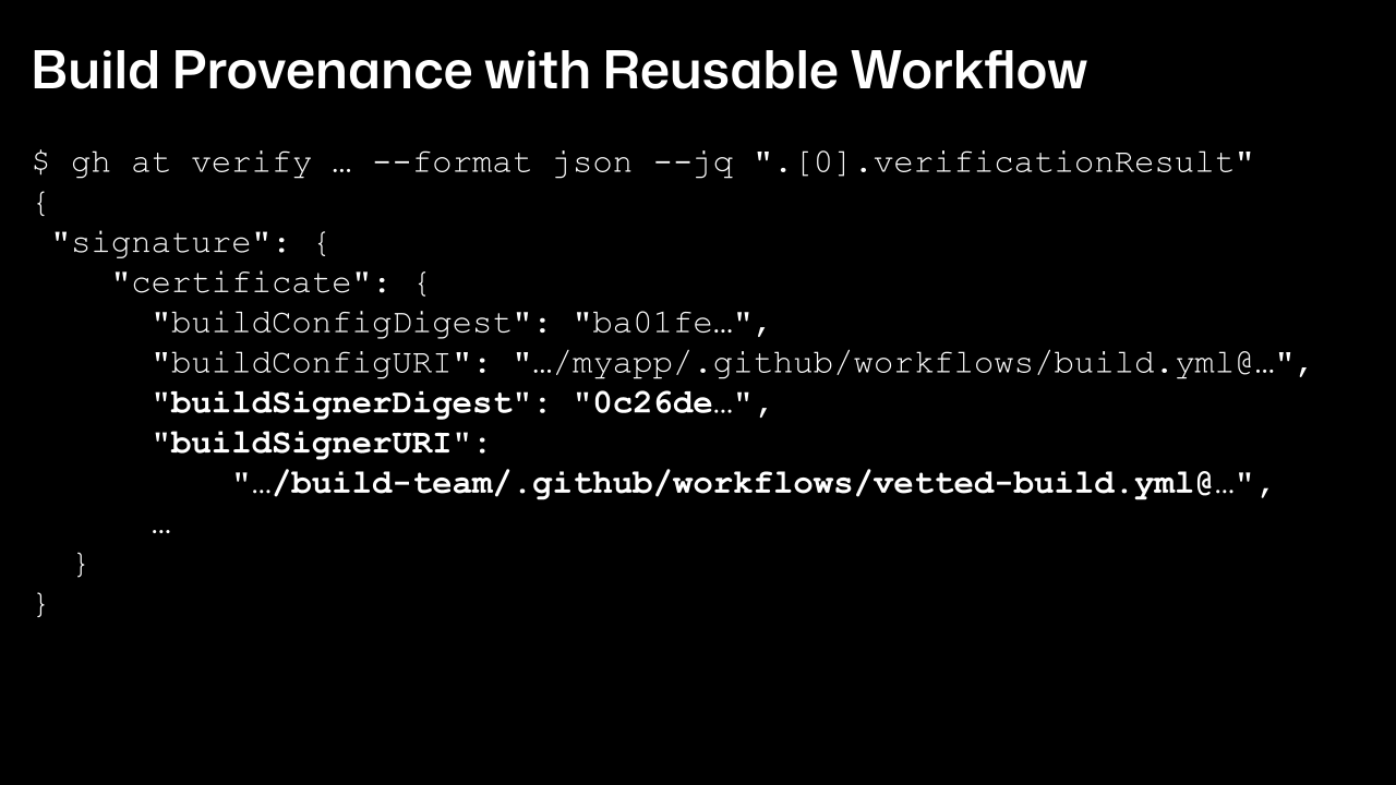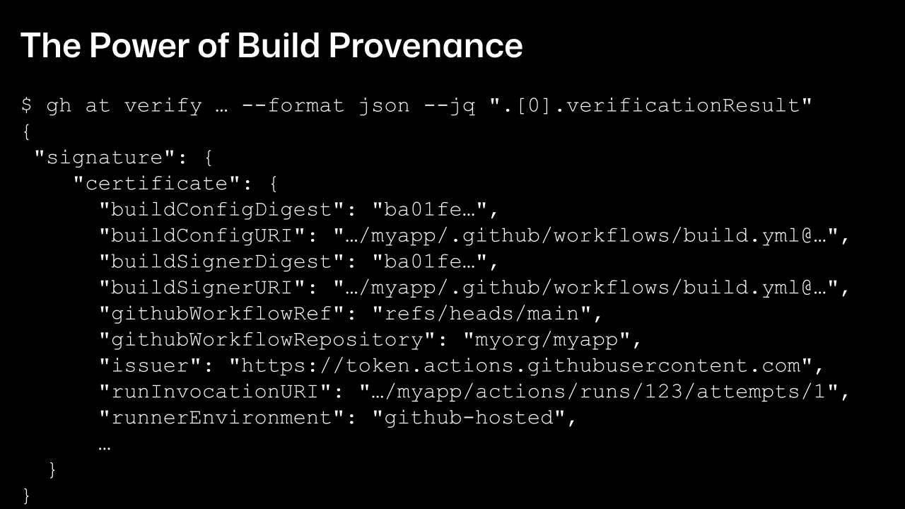 Here we're taking that same verification command, except we're asking it to output all of the build provenance in JSON format. You can see there's a lot of additional information in the attestation: the exact commit the build came from, if that commit was the head of a branch at the time, a link to the build logs, and even that the build took place on a GitHub-hosted runner instead of a user-hosted one.