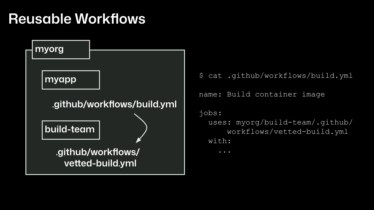 On the left we have our same GitHub organization, but now the myapp repository is using a vetted build process maintained in the build-team repository. On the right we show what the new myapp build instructions look like - it calls the reusable workflow, and can pass arguments in using the with: keyword.