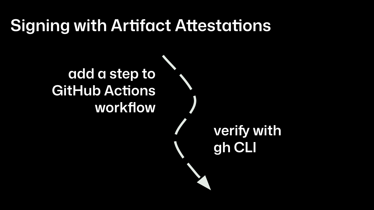 We built Artifact Attestations to streamline this process. To sign something you built in Actions you add a step to the end of the workflow, and then you can easily verify that signature by using the gh CLI. Let's see what that looks like.