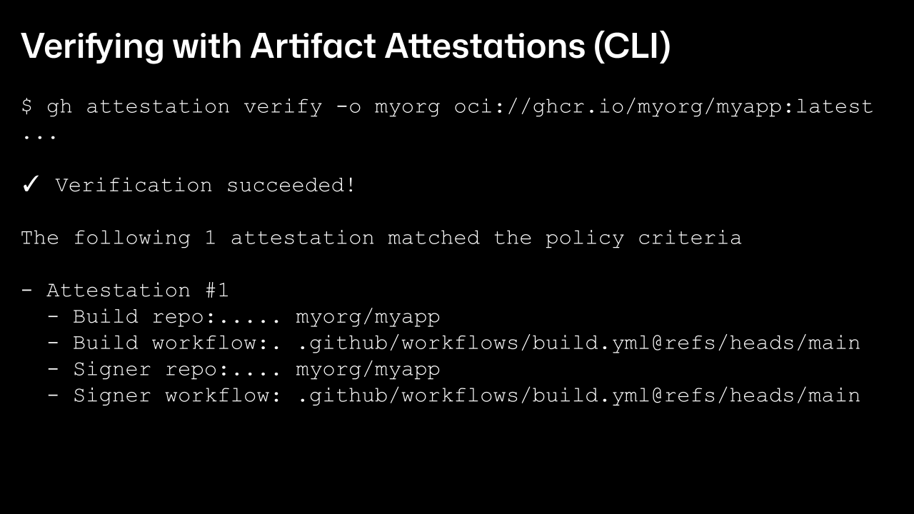 To do that, we can use the gh attestation verify command. We use the -o flag to tell it what organization we're expecting the attestation came from. Not only does this tell the command the attestation API endpoint for your organization to call, it also creates a very basic verification policy where we're checking to make sure the Action that built this artifact ran in our organization. And lastly we tell the command what container image or file on disk we want to verify.