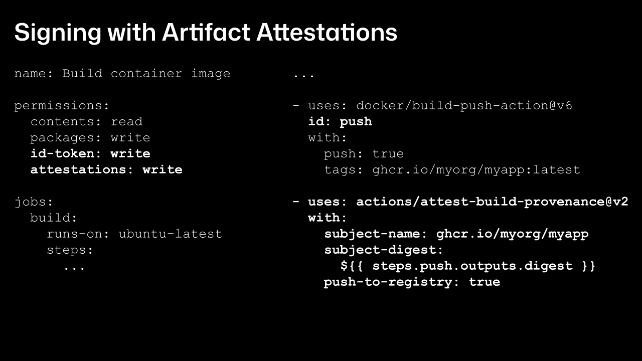 Here we have a GitHub Actions workflow building a container image, and the bold lines are what we need to add for signing. The build provenance comes from the Actions workload id token, so we're requesting the write permission so we can get that token. We also are requesting the attestation write permission so we can save the signature to GitHub's attestation API.