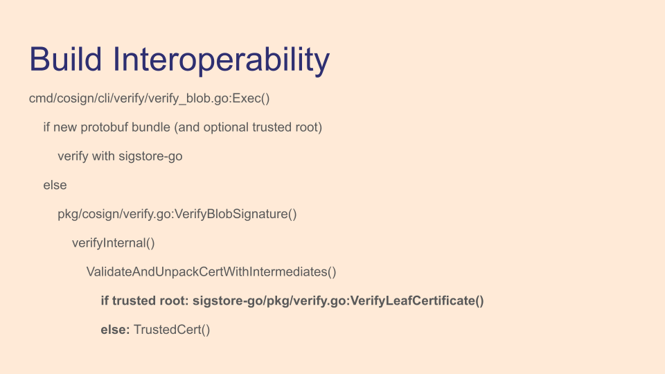 cmurphy is working on updating cosign to use the TUFv2 client, and part of that is moving to fetching the trusted_root.json target instead of disparate verification material. That's great, but remember how that means there might be multiple valid verification material for a given time? cosign doesn't handle that, and we didn't really want to re-implement that capability from sigstore-go, so cmurphy came up with a clever solution. In cosign's verification path, we check if we have a trusted root, and if so we call the sigstore-go function to do that specific verification step.