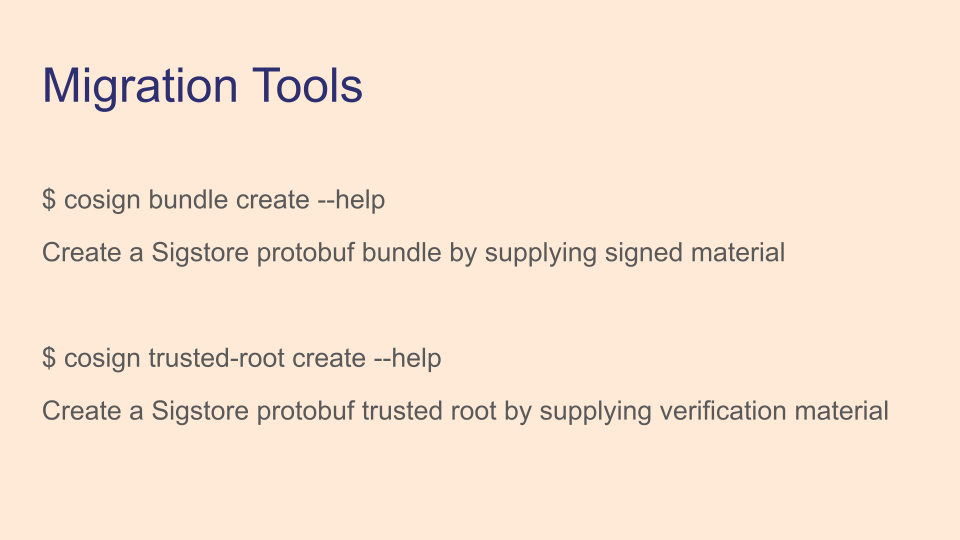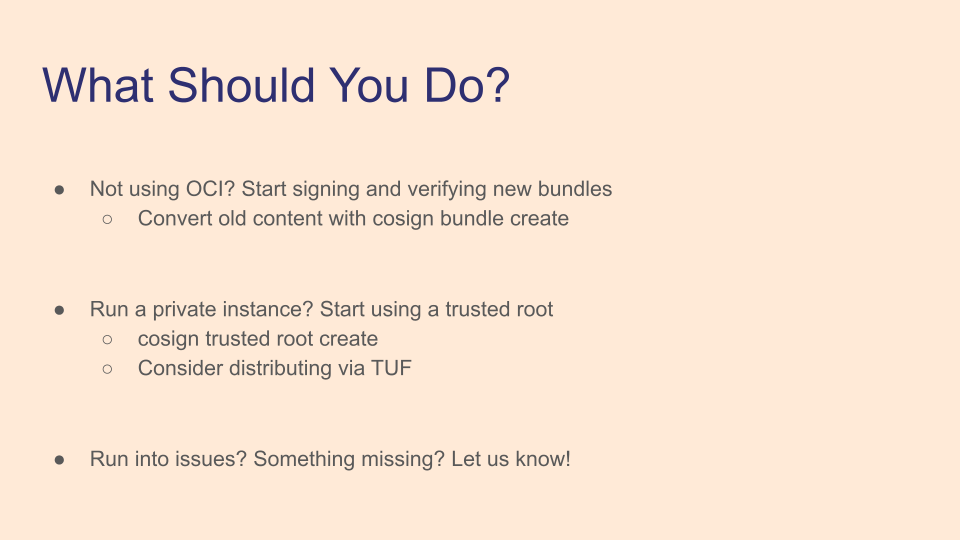 If you use cosign and aren't working with OCI, we're ready for you! You can convert your old signed content with cosign bundle create and start verifying protobuf bundles. If you run a private deployment of Sigstore, you can move to using the trusted_root.json file, and we strongly recommend distributing it via TUF for easy key rotation. We're still working on this transition, so if there's something missing or something else you'd like to see, let us know!