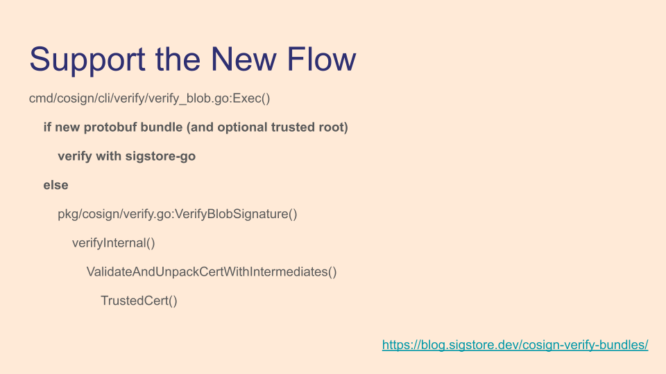 The first thing we did is add an if statement at the top of non-OCI verification commands, so if you're using a protobuf bundle (and optionally a trusted root) we just call the top-level sigstore-go verification API instead of using the existing cosign verification path. Branching the verification path isn't great, but sigstore-go has gone through external audits and runs conformance testing, where cosign does not.