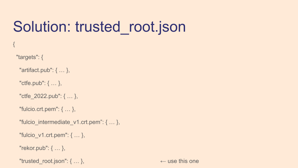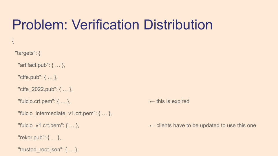 There's one more problem with verification content - how to distribute it. Shown here are the TUF targets of the public good instance, and the current implementation fetches different files for Fulcio or Rekor verification. You can see this has already lead to a problem, as when we rotated Fulcio verification material we went from fulcio.crt.pem filename from fulcio_v1.crt.pem. Clients had to be updated to use this new filename, or they would fail to verify newly signed content.