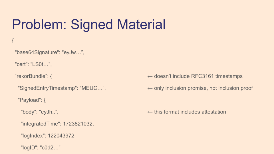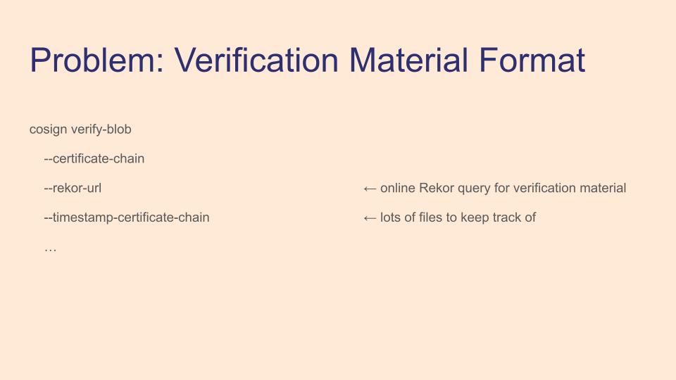 Here's an example of the confusingly-named cosign bundle, not to be confused with the newer protobuf bundle. If you don't use the cosign bundle, you have a bunch of files on disk you have to keep track of that make up your signed material. But even if you use the cosign bundle, it doesn't include signed timestamps, so if you're using those you still have another file to keep track of outside the bundle. The Rekor entry in the bundle has an inclusion promise, which is nice, but no inclusion proof, which is needed for verification. This means that verification requires a network call to Rekor, which we're trying to avoid.