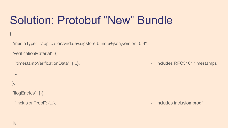 The protobuf bundle was developed to address these shortcomings. It has space for signed timestamps, and it has the Rekor inclusion proof. It's one file that has all the information you need for offline verification.