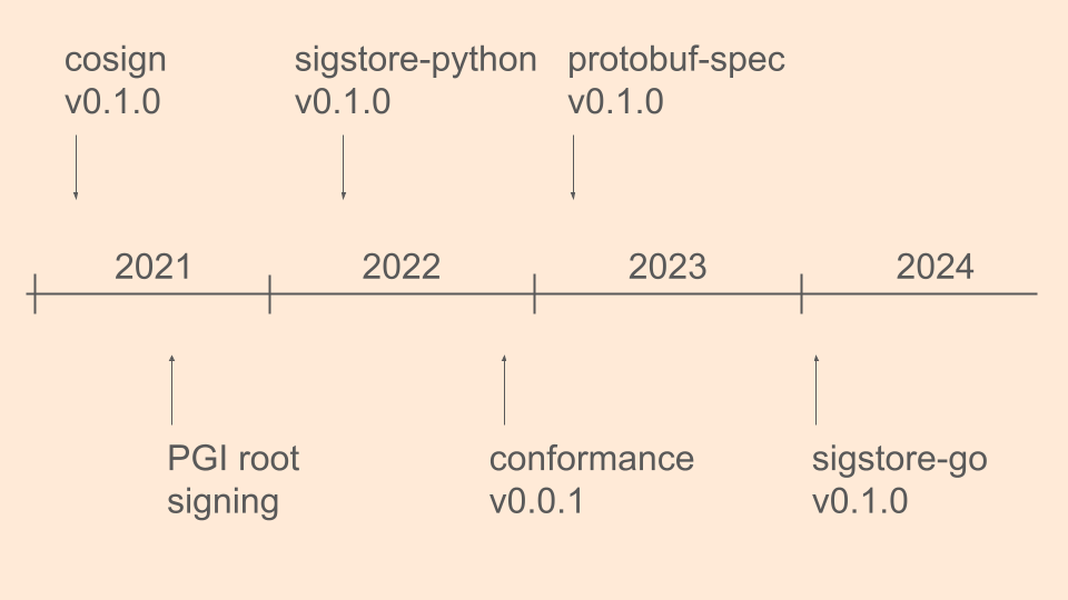 We made progress towards that compatability with the conformance tests, first released in late 2022, which codified a verification API and what scenarios verification should succeed or fail. Early 2023 saw the first release of the protobuf-spec, which standardized file formats for signed content and verification content, to help Sigstore components be interoperable. The client libraries all adopted conformance testing and the protobuf-specs, but cosign was never updated to make use of these specifications.
