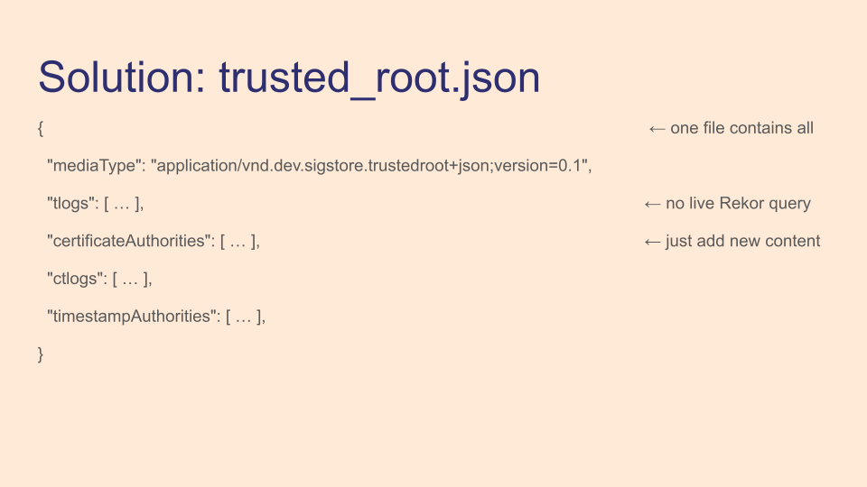 Protobuf-specs include a trusted root file specification to address this shortcomings. Rekor transparency log keys are included in it, and crucially each section of verification material is a list, not a single element, with start and end times. This makes it much easier to rotate key material, but it does mean that for a given time there might be more than one set of verification material that's valid - that'll come up again in a few slides.