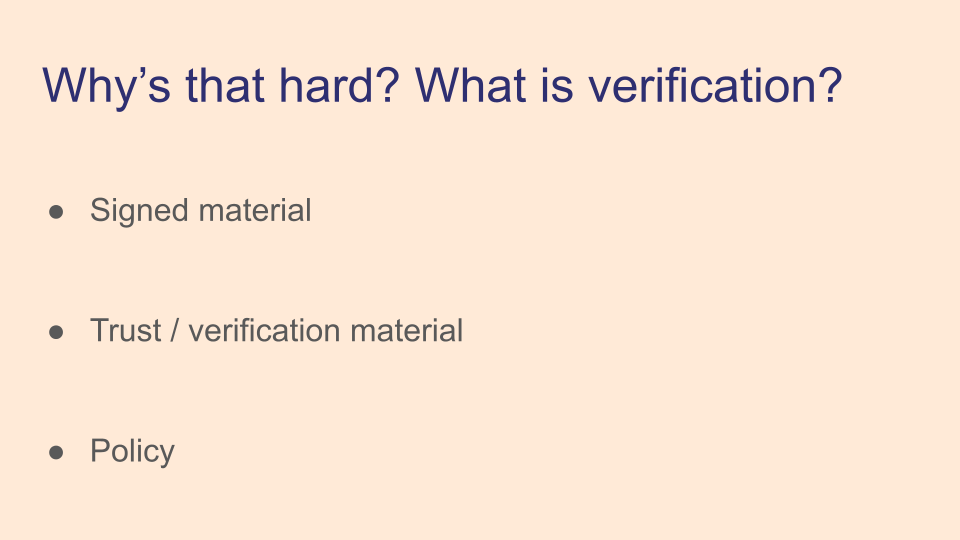 This talk mostly focuses on verification, and as a reminder there's several inputs to the verification process. First you have your signed material, which could refer to a container image or a file on disk. Then you have your verification material with which to check the signed material. This is a combination of public keys and certificate chains for things like Fulcio certificates, transparency log entries, and timestamp authorities.