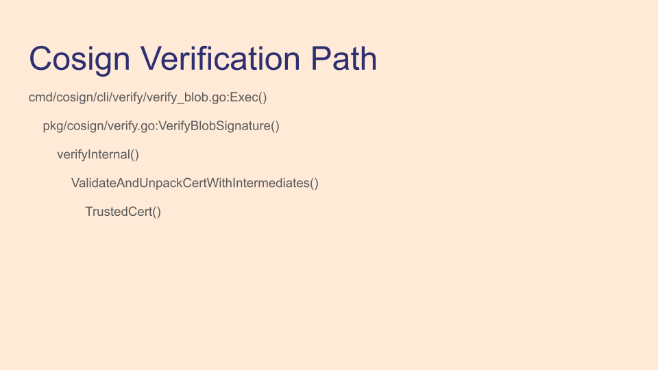 Here's an oversimplification of the cosign verification path. This example is from cosign verify-blob, but, if you aren't using OCI, all the commands use pkg/cosign/verify.go and call through verifyInternal(). There are many steps to verification, so here we're only showing Fulcio verification functions.