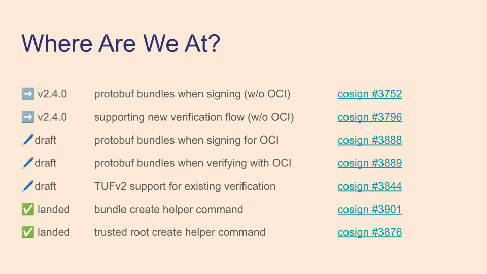 We didn't talk much about signing, but it's very easy to output a protobuf bundle at the end of a cosign signing operation, when you have all the signed content available. Signing, along with verifying with protobuf bundles (as long as you aren't using OCI) landed in cosign v2.4.0.